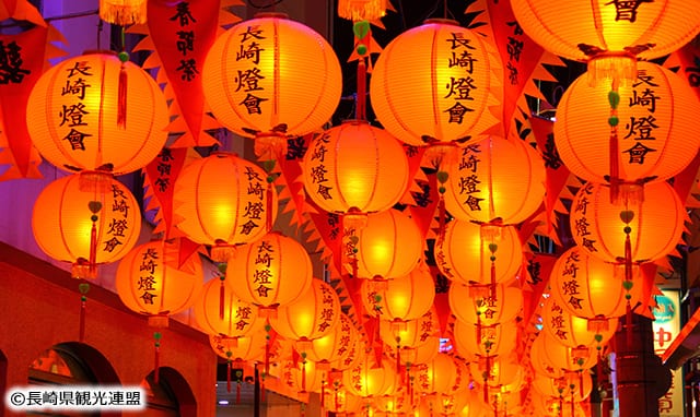 長崎新地中華街をはじめ、長崎市内の中心部に約15,000個にも及ぶランタン(中国提灯)や、大型オブジェが飾られ、幻想的に街を彩ります。(毎年1月末から2月頭。春節に合わせて2週間開催)