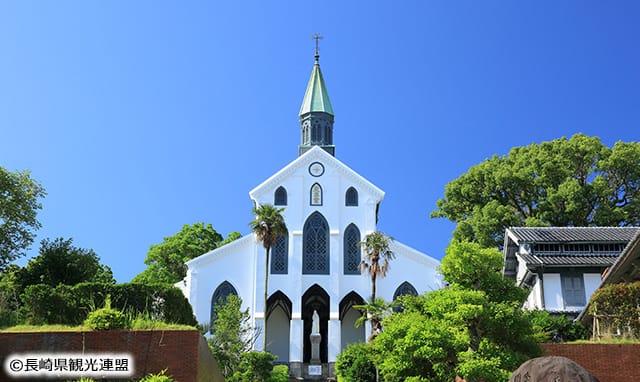 大浦天主堂は、幕末の開国にともなって造成された長崎居留地に、在留外国人のために建設された中世ヨーロッパ建築を代表するゴシック調の教会で、現存するものでは国内最古となります。1933年に国宝となりましたが、原爆による損傷の修復が完了した後、現存する日本最古の教会建築として1953年に再度国宝に指定されました。