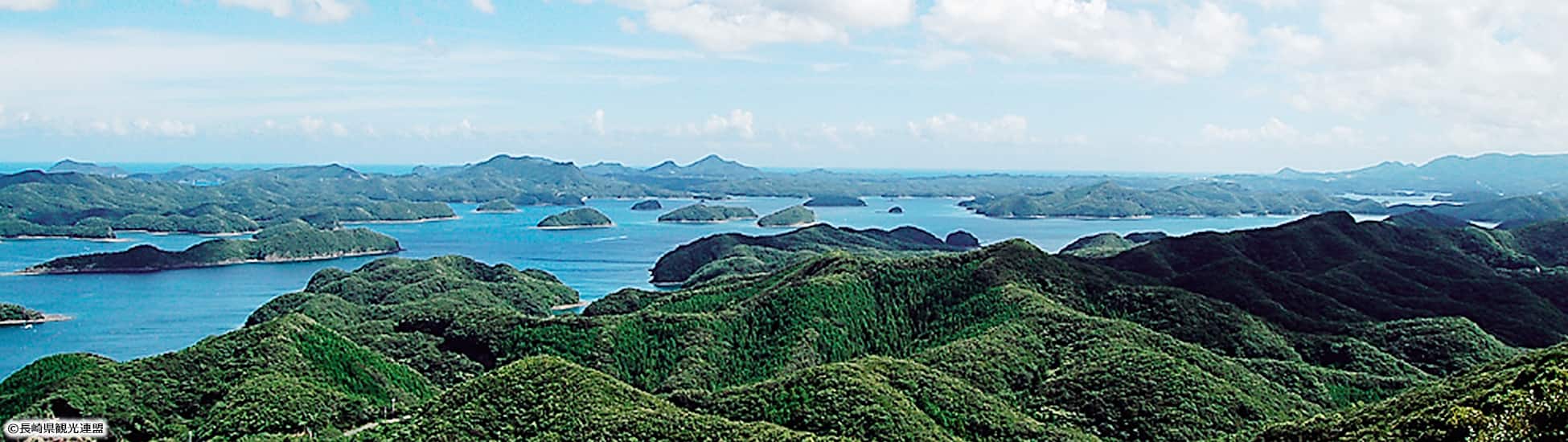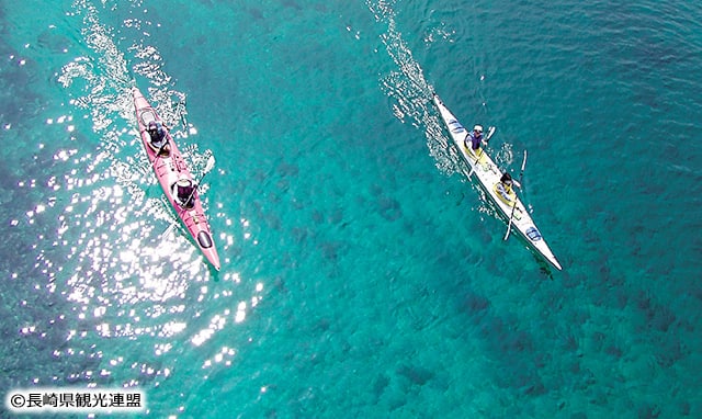 対馬の中央に広がる浅茅湾(あそうわん)は、複雑な入り江と無数の島々が織りなす典型的なリアス式海岸で全域が壱岐対馬国定公園に指定されている風光明媚な海域です。カヤック体験なども人気です。