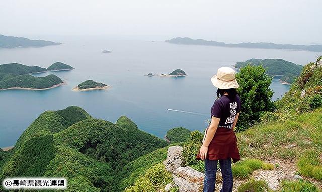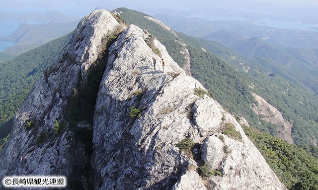 白嶽(しらたけ)は古来より霊山として崇められた対馬のシンボル的存在。大陸系植物と日本系植物が混生する独自の生態系をもつ原生林として、国の天然記念物に指定されています。春・秋には大陸系植物が開花し、山頂からは360度の眺望が広がり圧巻です。山頂近くは急傾斜でロープにつかまりながら岩場を登るためスリル満点!登りきると浅茅湾や白嶽山系の山々、天候が良いときは韓国の山並みをも望むことができます。