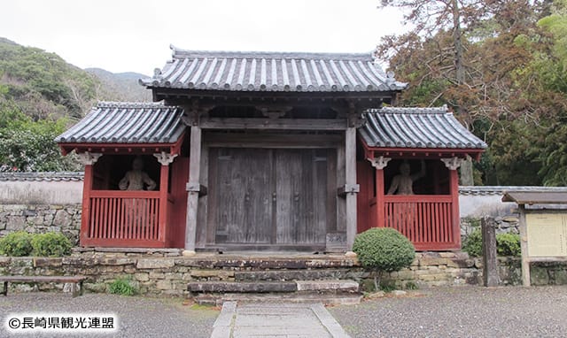 その後数度の火災により焼失したため今の本堂は明治12年(1879年)に建造されたものです。安土桃山式の山門と仁王像は焼失から免れた対馬最古の建物で、堂内には朝鮮国王から贈られた三具足、徳川将軍の大位牌が並んでいます。さらに132段の百雁木と言われる石段が幽玄な雰囲気を醸し出しています。