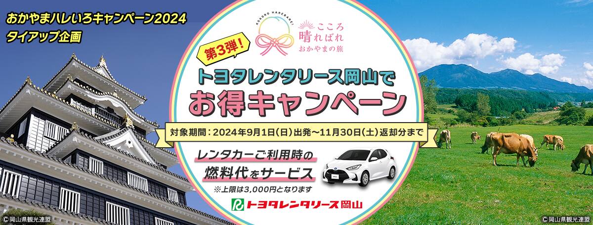 対象期間中に岡山空港着ANA便を往復ご利用いただき、トヨタレンタカー岡山空港店でレンタカーをご利用のお客様を対象に、レンタカーご利用時の燃料代を上限3,000円(税込)まで負担いたします。レンタカーでご出発およびお車返却時に、モバイル搭乗券等、ご搭乗を証明できるものをご提示ください。
