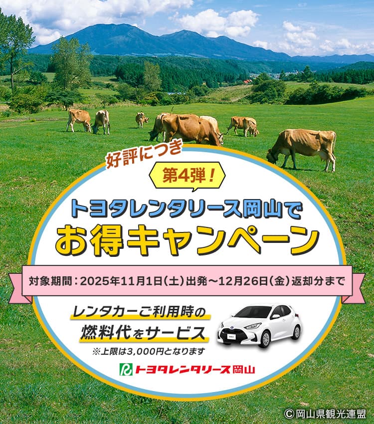 お問い合わせの際は、「第4弾!トヨタレンタリース岡山でお得キャンペーン」とお申し出ください。