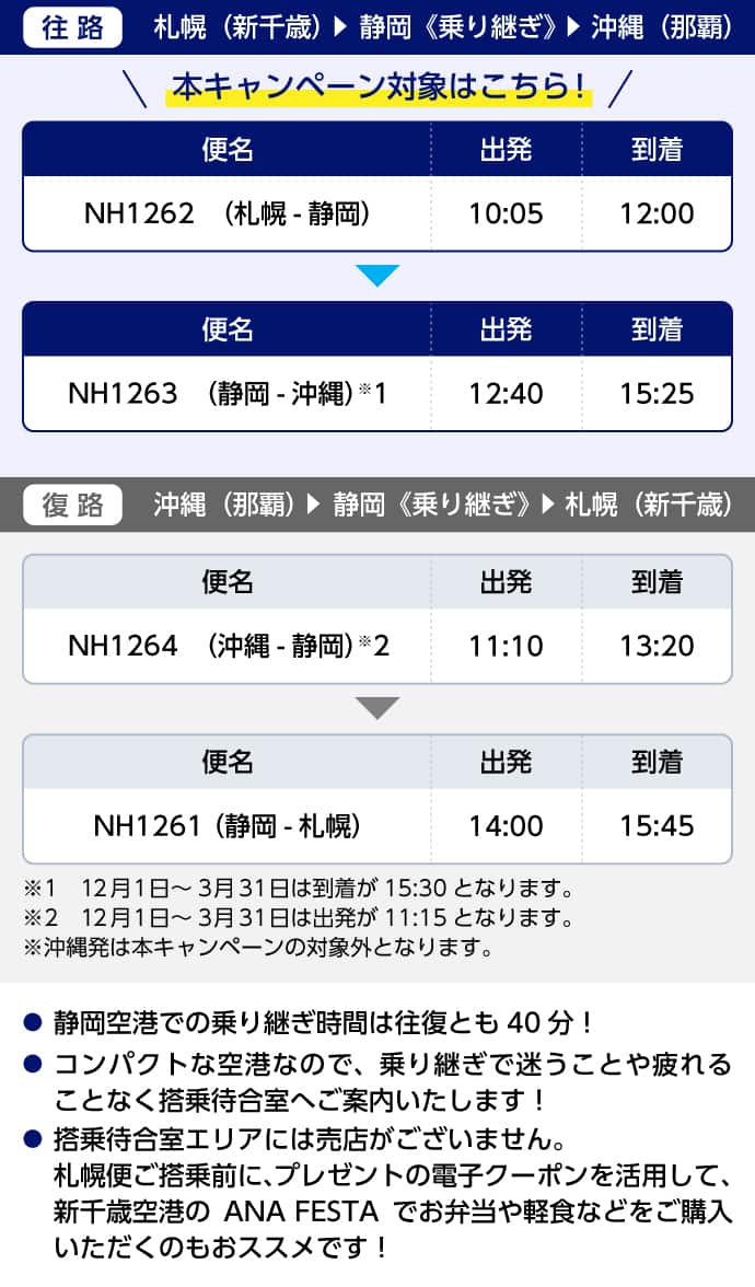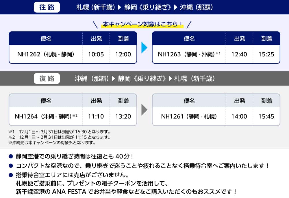 札幌から沖縄行きのご旅程を静岡空港乗り継ぎでご利用いただく方、先着400名様に新千歳空港、および那覇空港のANA FESTAで利用できる1,500円分の電子クーポンをプレゼントいたします。さらに、ANAマイレージクラブ会員の方には抽選で10名様に静岡の名産品が当たるWチャンスも!この機会に、ぜひ静岡空港での快適なお乗り継ぎをお試しください。