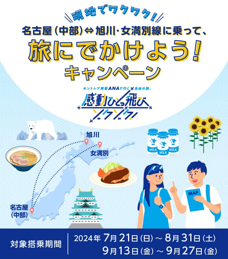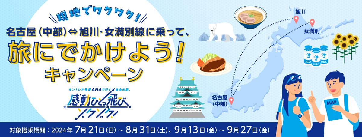 お問い合わせの際は、「現地でワクワク!名古屋⇔旭川・女満別線に乗って、旅にでかけよう!」とお申し出ください。