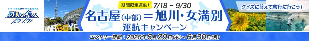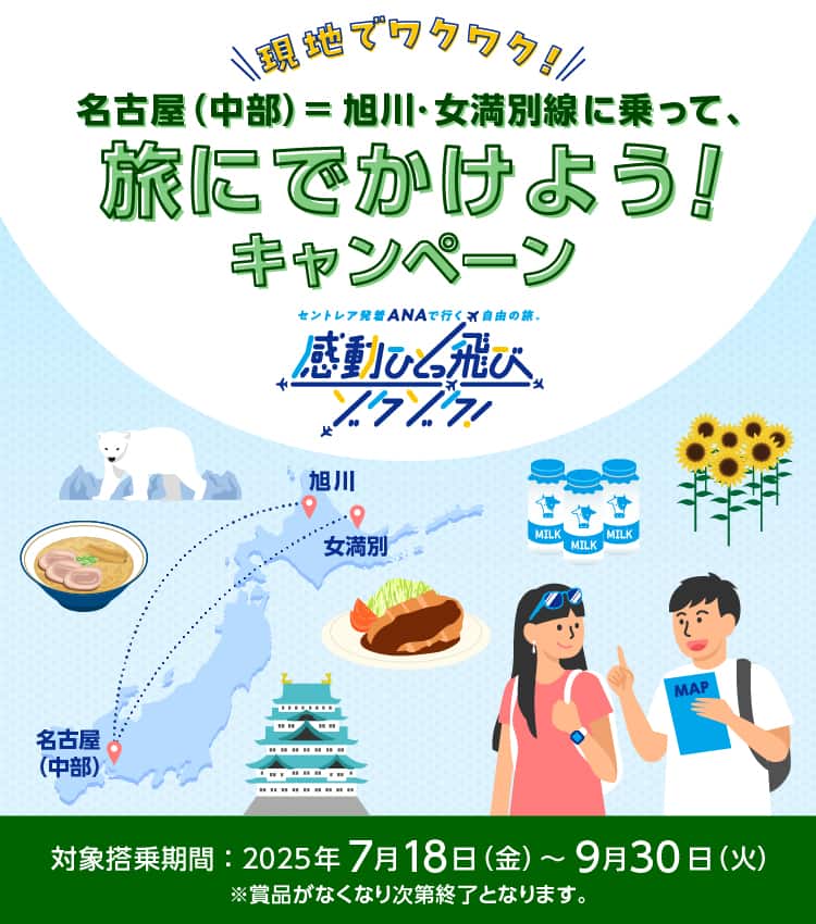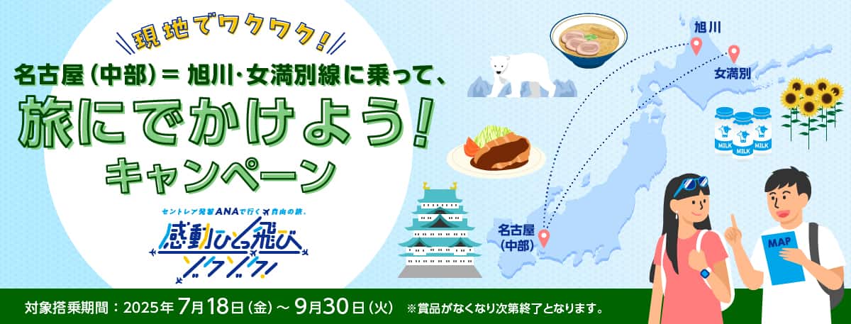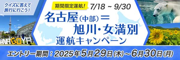 お問い合わせの際は、「現地でワクワク!名古屋(中部)=旭川・女満別線に乗って、旅にでかけよう!」とお申し出ください。