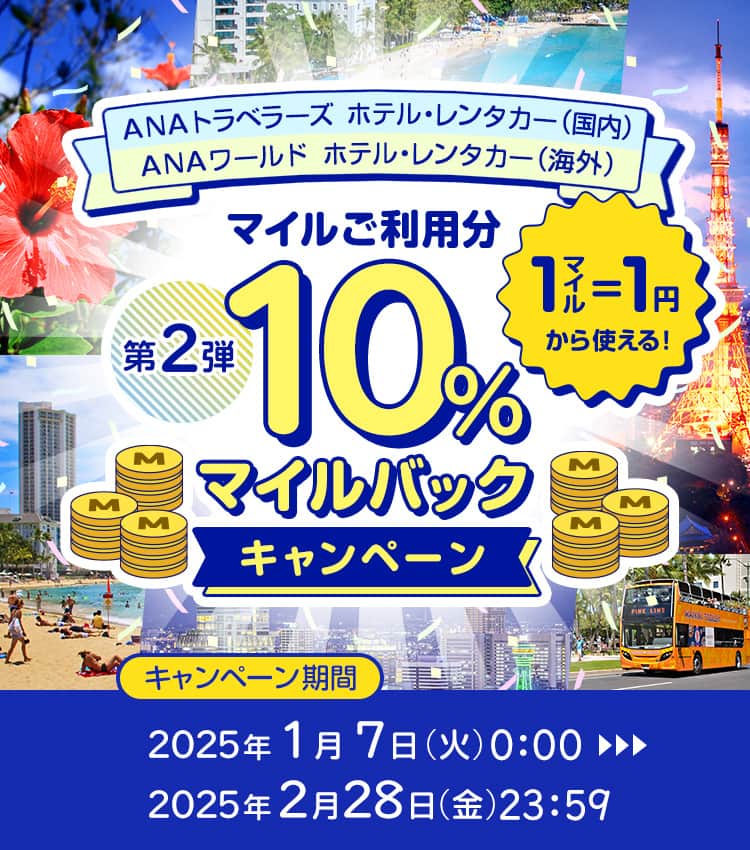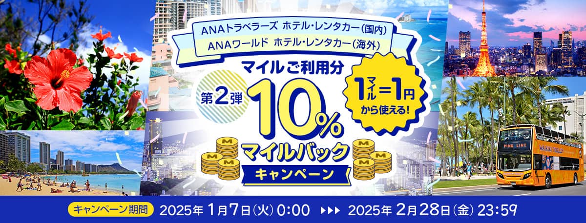 対象期間中のキャンペーン参加登録と、利用対象期間のANAトラベラーズホテル(国内)、ANAワールドホテル(海外)、ANAトラベラーズレンタカー(国内:オリックスレンタカー、バジェットレンタカーのみ対象)、ANAワールドレンタカー(海外)をマイルでご予約・ご利用された方に、マイル決済分の10%がマイルバック!貯めたマイルは1マイルにつき1円相当として1マイルからお使いいただけます。この機会にぜひご利用ください!