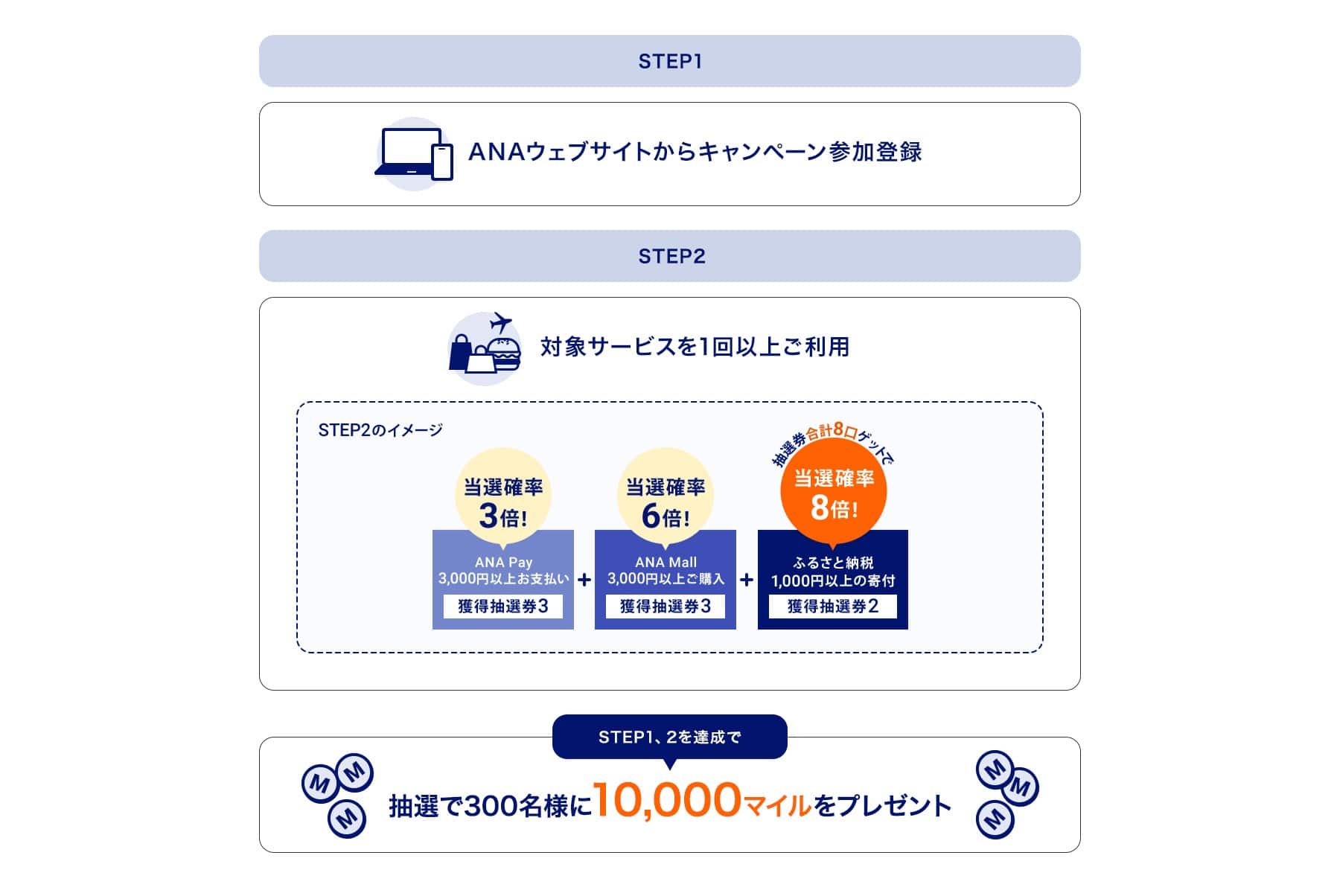 キャンペーン期間中、参加登録と対象サービスのご利用条件を達成された方の中から抽選で300名様に10,000マイルをプレゼントいたします。