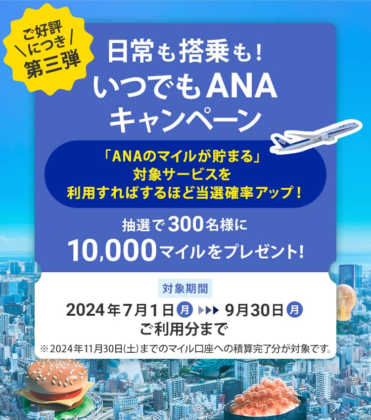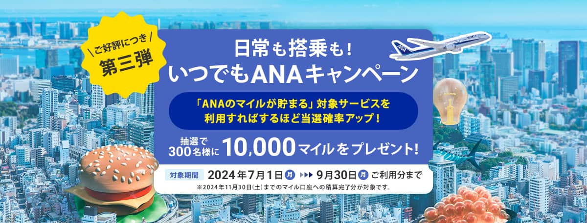 キャンペーン期間中に対象サービスをご利用・ご購入されても、マイル口座への積算完了が2024年11月30日(土)を過ぎた場合は、抽選対象にすることができません。キャンペーン終了間際のご利用は、期間内にマイルが積算されない場合がありますのでご注意ください。
