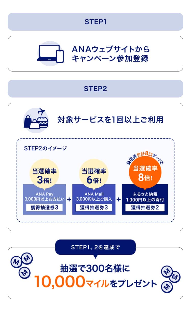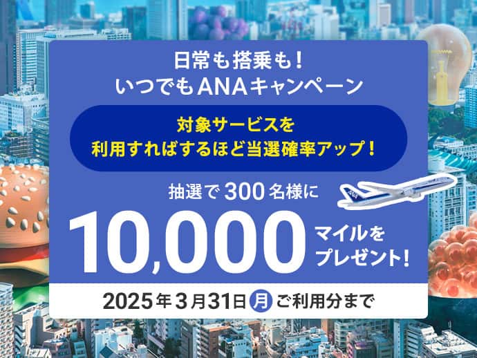 キャンペーン期間中、参加登録と対象サービスのご利用条件を達成された方の中から抽選で300名様に10,000マイルをプレゼントいたします。
