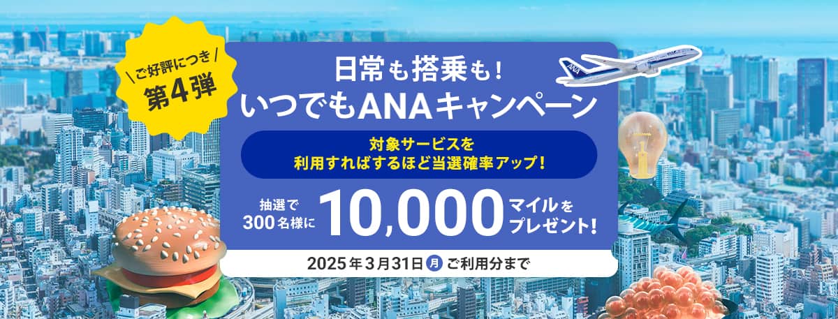キャンペーン期間中に対象サービスをご利用・ご購入されても、マイル口座への積算完了が2025年5月31日(土)を過ぎた場合は、抽選対象にすることができません。キャンペーン終了間際のご利用は、期間内にマイルが積算されない場合がありますのでご注意ください。