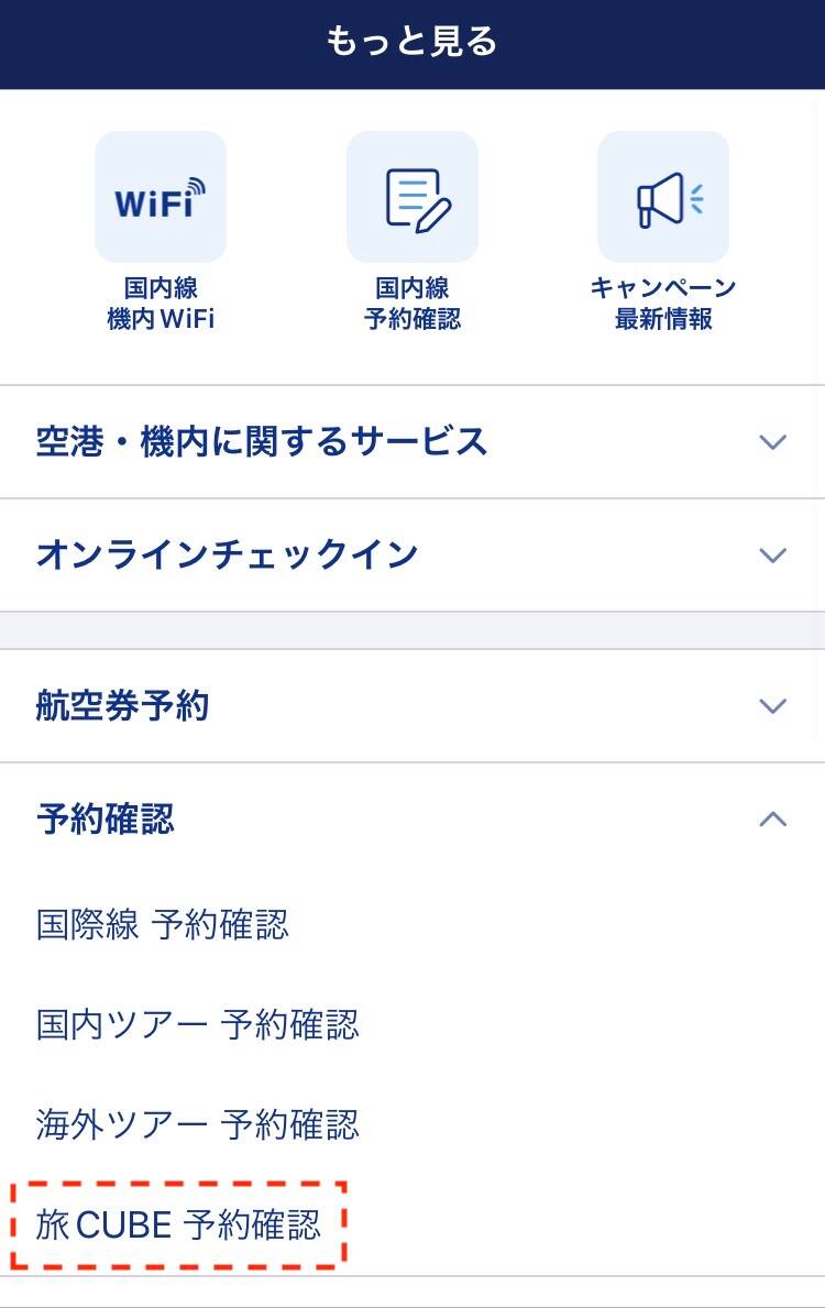 「もっと見る」タブの「予約確認」内、「旅CUBE 予約確認」をタップ!!