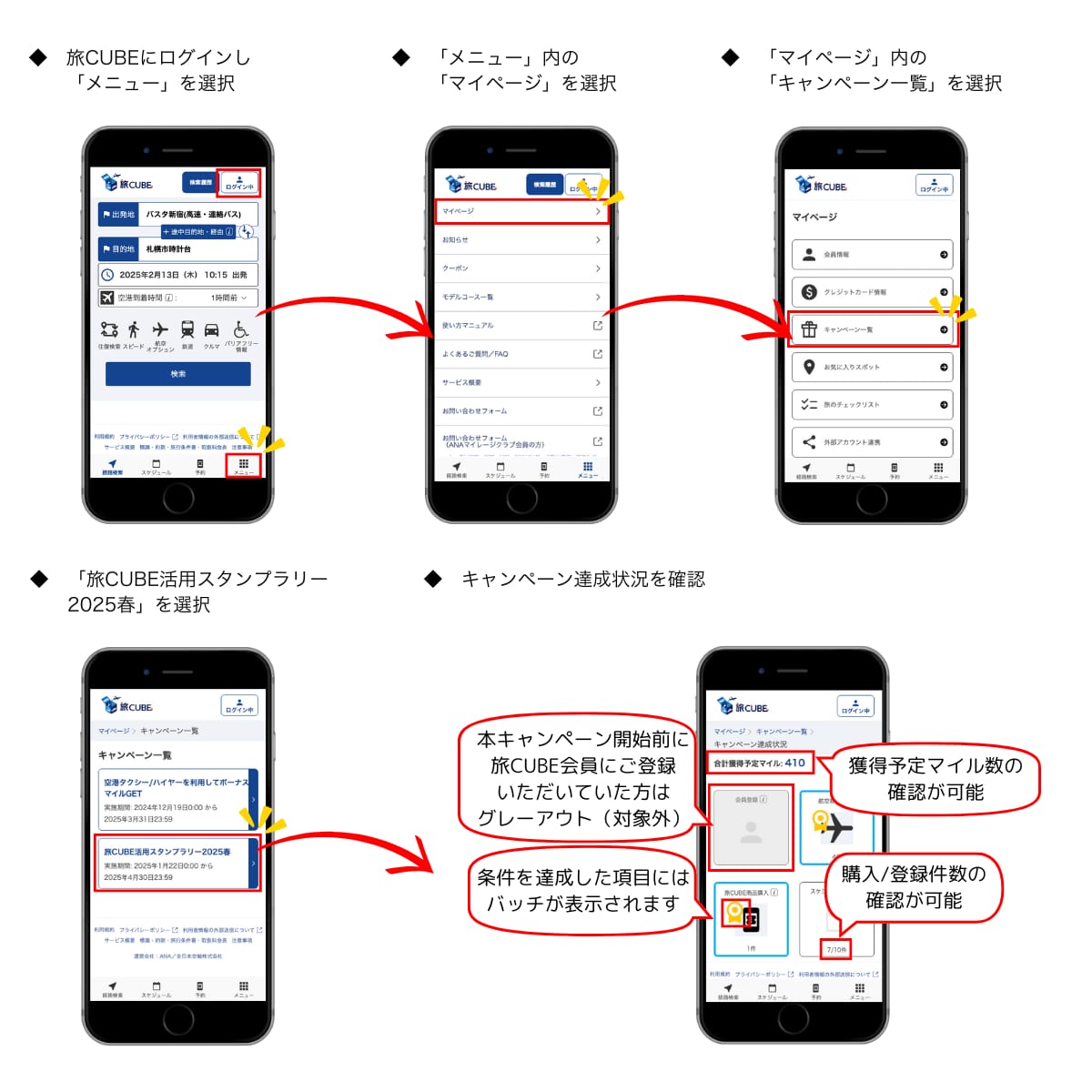 キャンペーン達成状況は、旅CUBEログイン後、メニュー>マイページ>キャンペーン一覧からご確認ください。