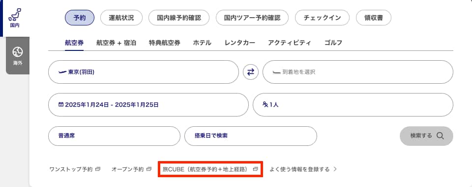 国内タブの予約を選択し、航空券内の「その他サービス+」を開き「旅CUBE(航空券予約+地上経路)」をクリック!