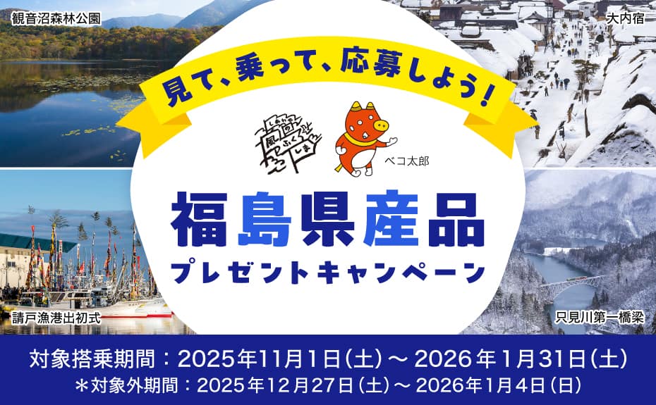 キャンペーン期間中、福島県の観光紹介動画をご視聴いただき、アンケート回答と参加登録のうえ、ANA福島空港発着路線を対象運賃で往復ご搭乗いただいた方の中から、抽選で福島県産品をプレゼントいたします。