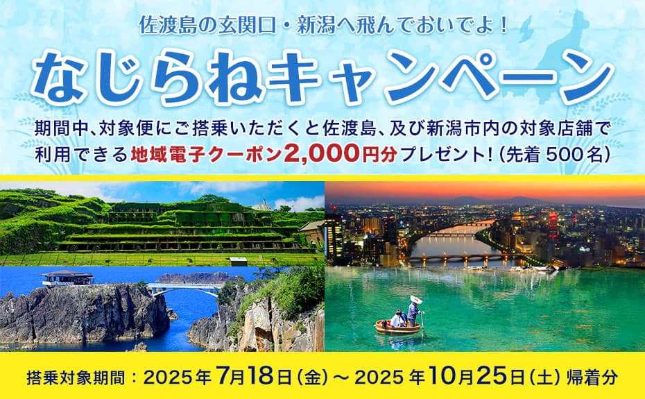 期間中、各地からANA新潟便を往復利用いただける方に、佐渡島、及び新潟市内の対象店舗で利用できる地域電子クーポン2,000円分を先着500名様にプレゼント中です!