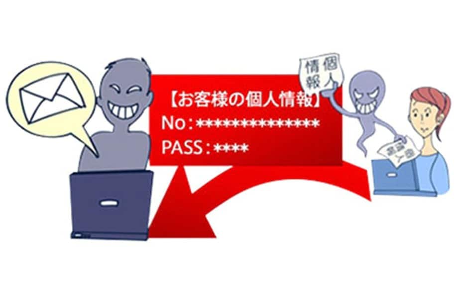 届いたメールには「情報確認のため」「個人プロフィールの更新依頼」などと称して巧みに偽のリンクをクリックさせようとしたり、偽サイトではお客様にご自身の個人情報(ID、パスワード、クレジットカード番号、銀行口座番号など)の入力を促すような工夫がされています。また、添付ファイルを開いてしまうと、ウィルスに感染し、PC内の個人情報を盗まれてしまう可能性があります。