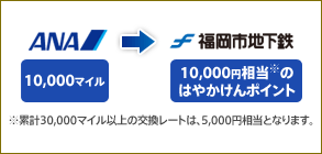 ANAマイレージクラブのマイルを10,000マイル以上お持ちのお客様は、10,000マイルを交換単位として、10,000円相当(※)の「はやかけんポイント」へ交換することが可能です。