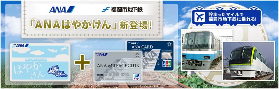 ANAカード・ANAマイレージクラブカードとリンクさせた福岡市地下鉄ICカード乗車券「ANAはやかけん」は、ANAカード・ANAマイレージクラブカードをお持ちのお客様のみお申し込みいただけます。ANAカード・ANAマイレージクラブカードをお持ちでないお客様は、あらかじめこちらよりご入会が必要です。