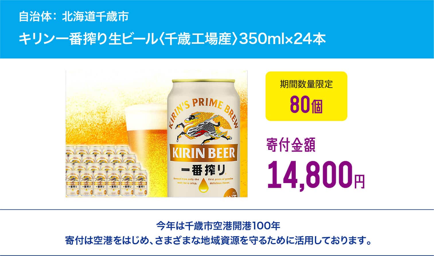 北海道の玄関口、新千歳空港の目と鼻の先にあるキリンビール北海道千歳工場で作られた一番搾り生ビール。一番搾り製法とは、ビール製造の過程において、素材である麦から最初に流れ出る一番搾り麦汁のみを使う製法のことです。麦本来のうまみが感じられる、調和のとれた雑味のない味わいのビールです。