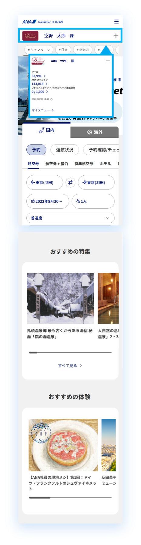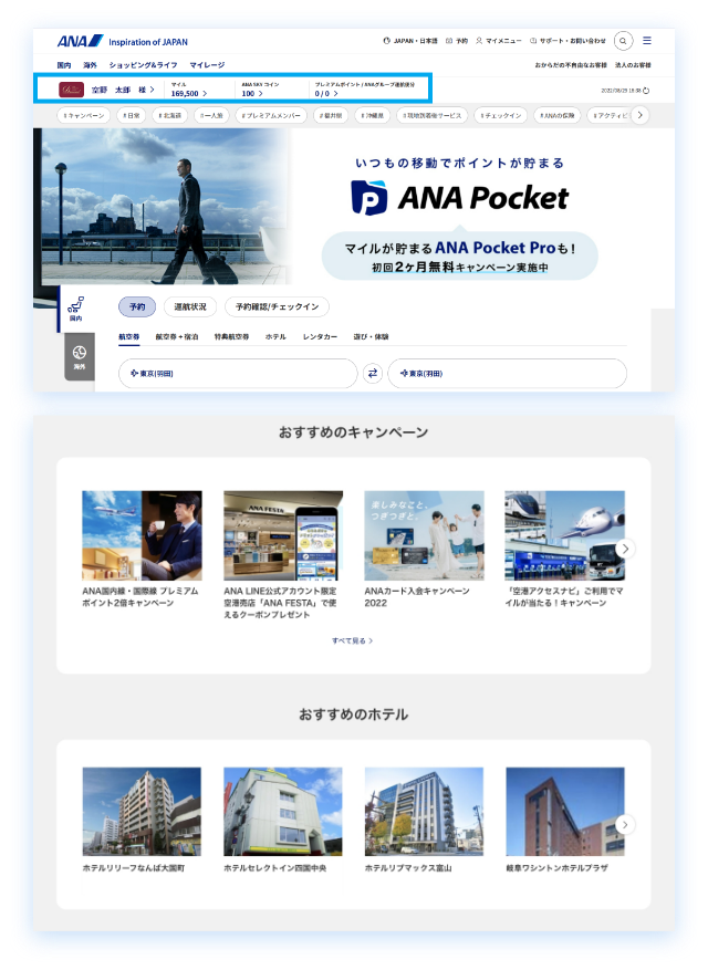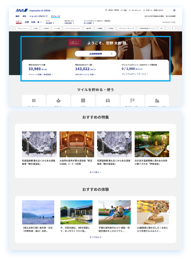 ログインしていただくと、お持ちのマイルやプレミアムポイントの数が常に表示され、会員サービスページへのアクセスも一段としやすくなります。