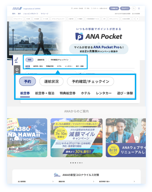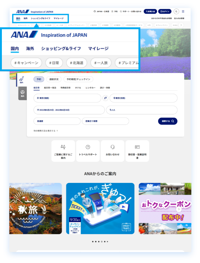 見やすく、使いやすく、探したいものがすぐに見つかる、生まれ変わったANAウェブサイトをぜひご利用ください。