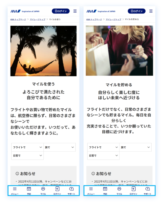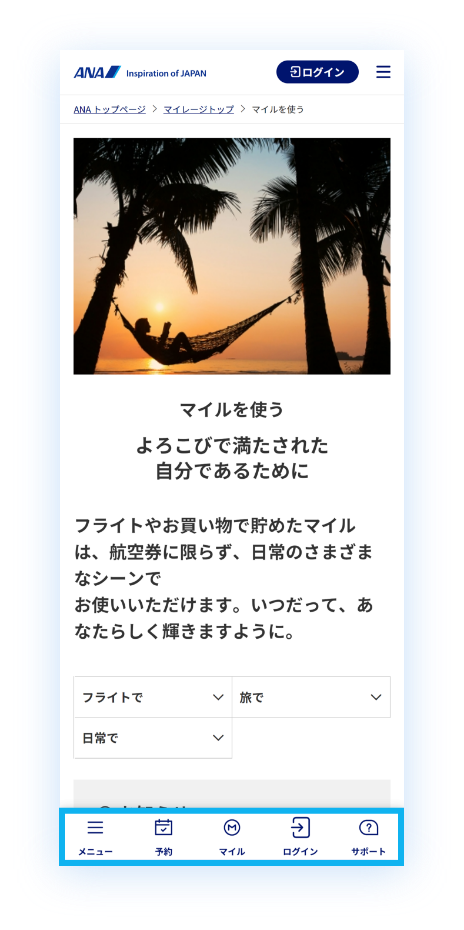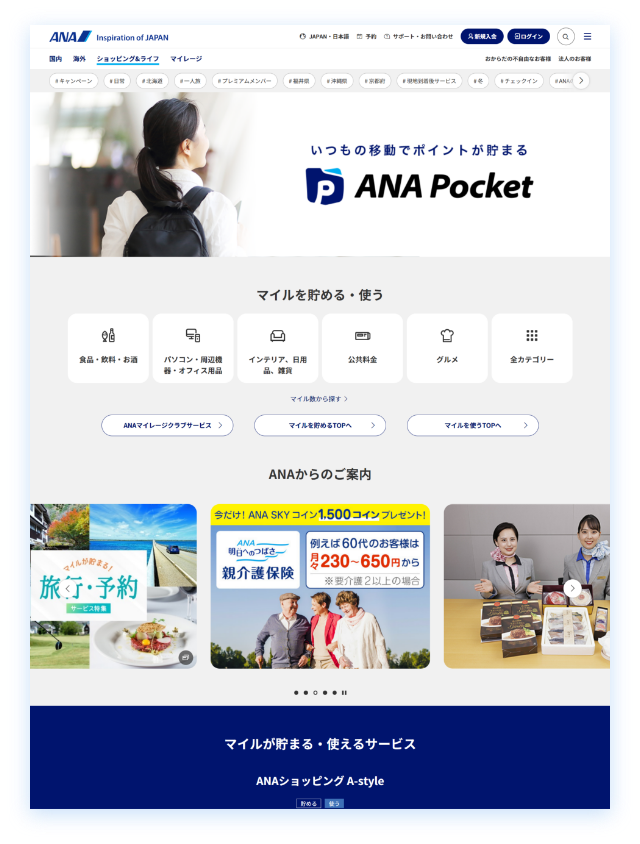 迷わずご希望の情報に辿り着けるよう、サイト内を「国内」「海外」「ショッピング&ライフ」「マイレージ」、4つのカテゴリーに分けました。