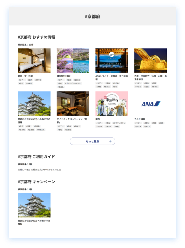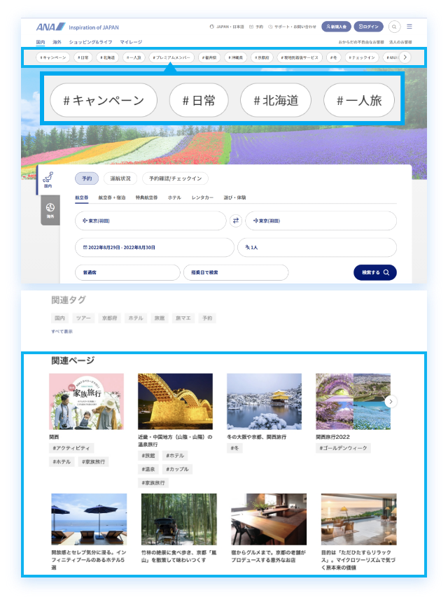 それぞれのページのキーワード(タグ)をもとに関連情報が自動で表示されるため、旅先の検討やサービスの検索がしやすくなります。