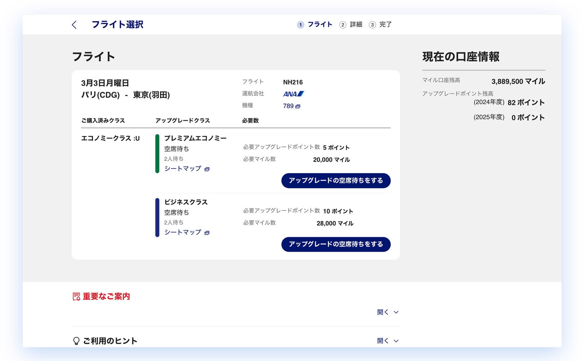 アップグレード空席待ちにあたり、各クラスごとの待ち人数が確認できるようになりました。