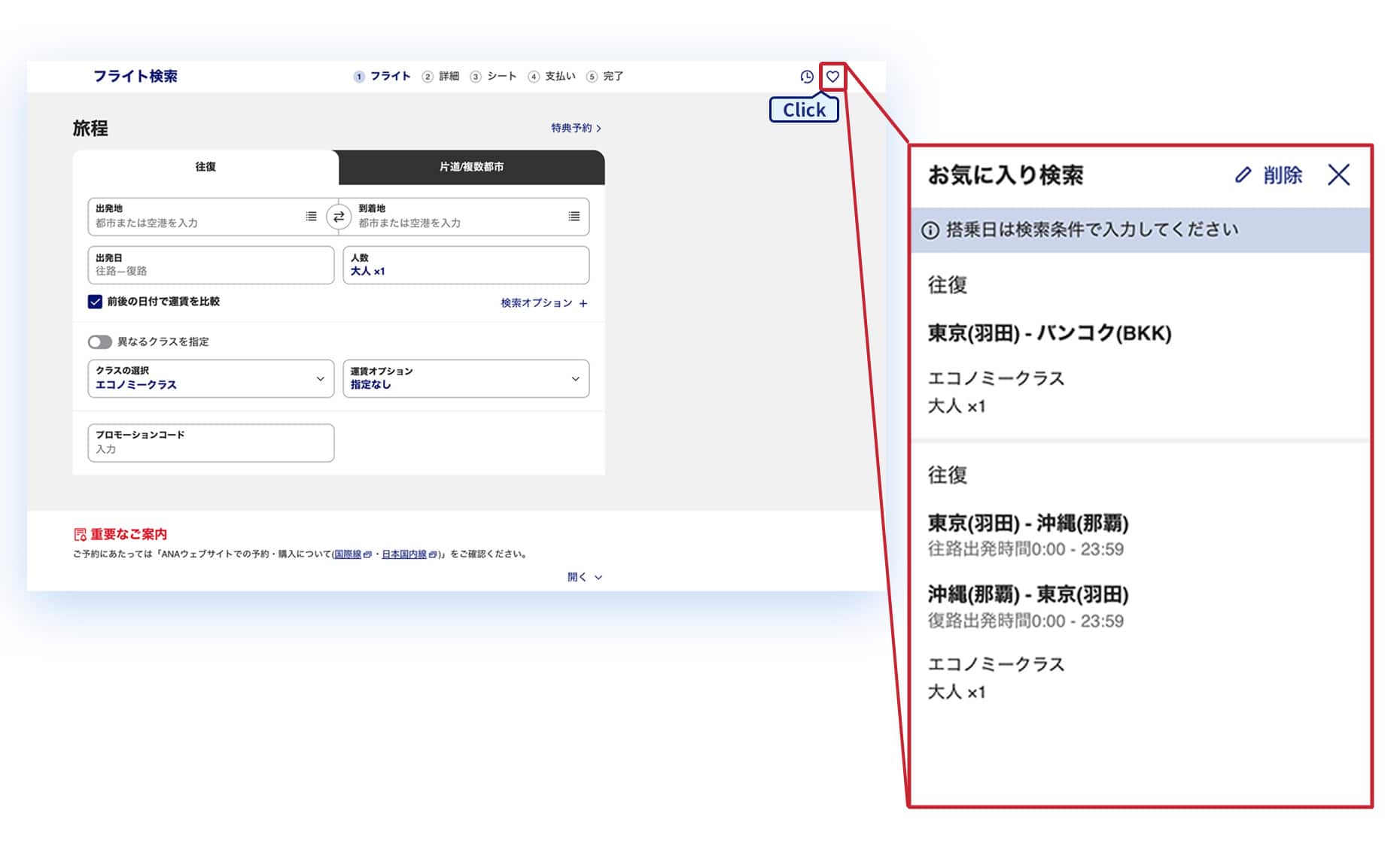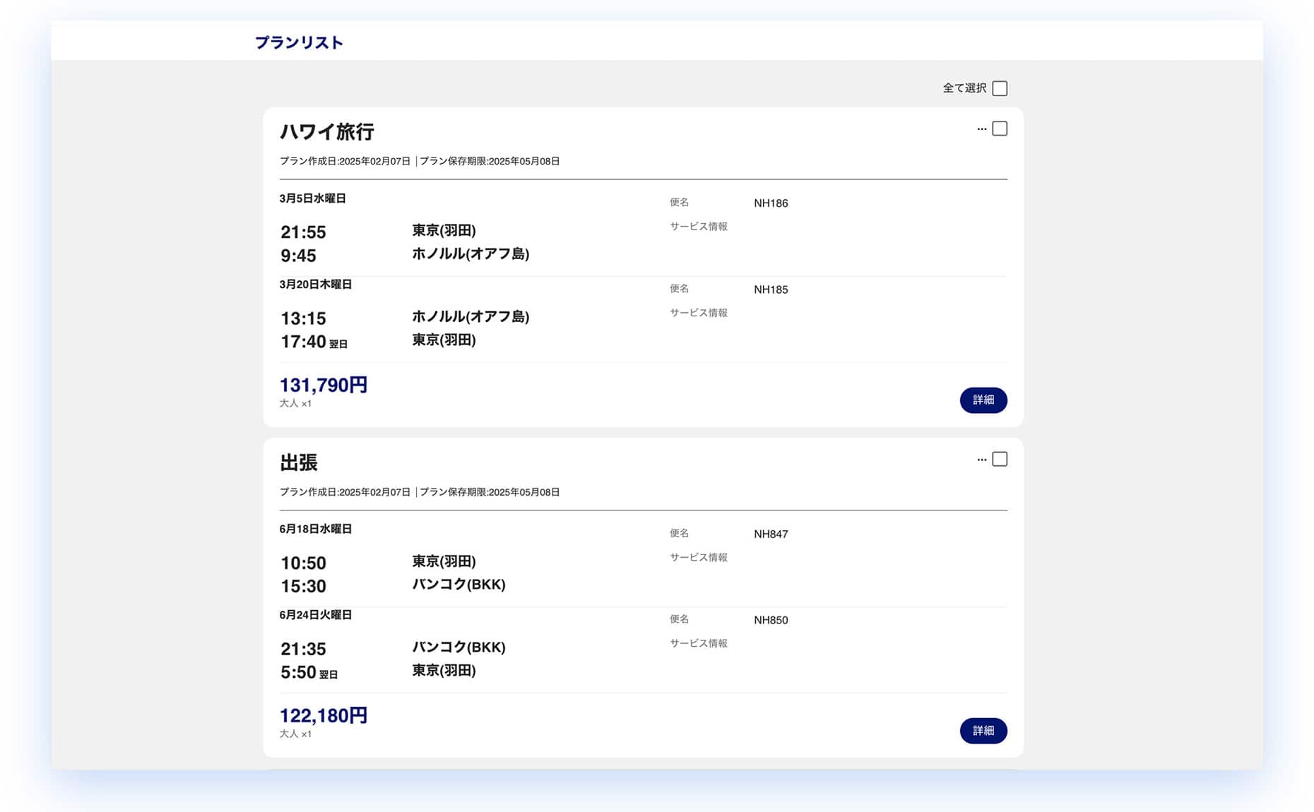 旅程はお気に入り登録をすることができ、次回以降の予約でも活用できます。