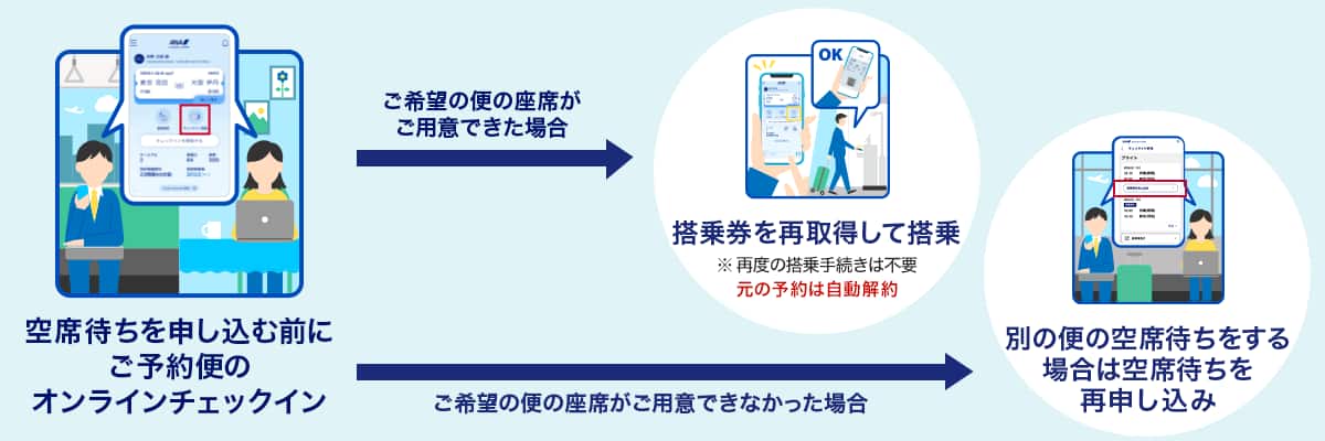 | 座席のご用意ができた場合 | 空席待ちで座席がご用意できた場合、元のご予約は自動解約されます。 *元のご予約でご搭乗される場合、空席待ち申し込み便の出発時刻20分前までに、必ず空席待ち申し込みの取り消しを実施してください。なお、座席がご用意できた便へ自動的に搭乗手続き済みになるため、お客様自身での空席待ちチェックインは不要になります。 |