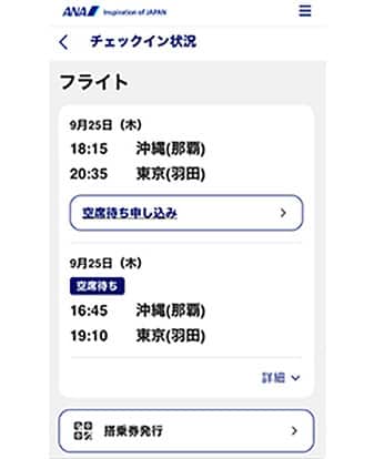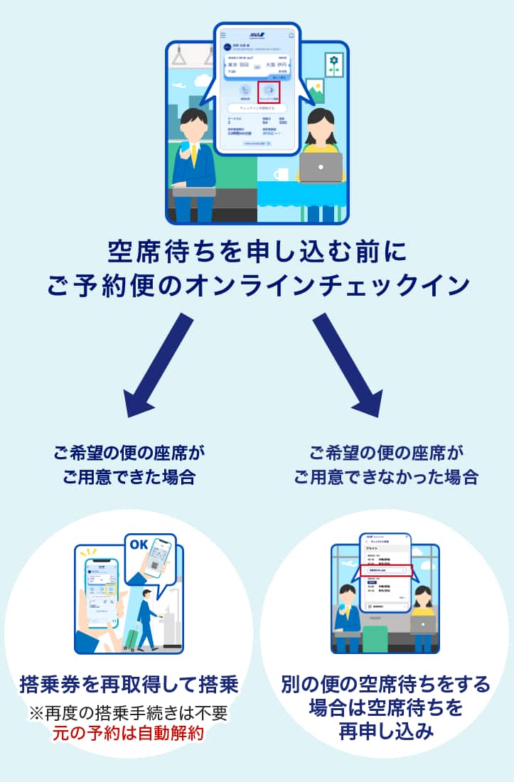 | 事前条件 | ANAウェブサイトで空席待ちを申し込む際は、当日の予約便の搭乗手続きが必要です。 |