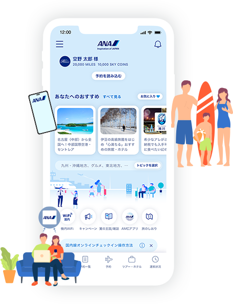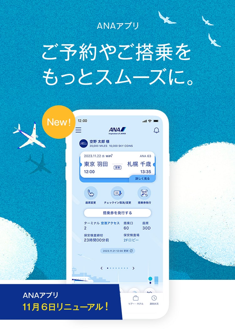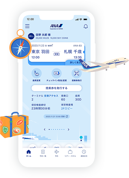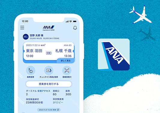 ANAアプリでは、空き時間や移動中など、いつでもどこでも気軽に空席照会やご予約が可能です。フライトの予定全てをアプリで管理。