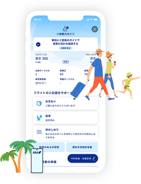 タイムリーに必要な情報をお届けし、ご搭乗までサポートします。国内線搭乗はアプリからオンラインチェックインを行い、旅行をスムーズに!