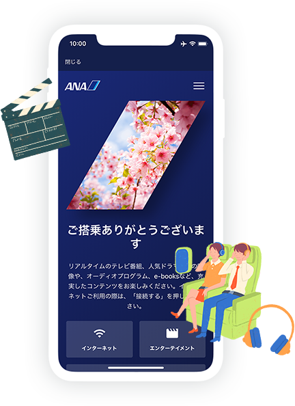 ANAアプリを利用すれば、空の上の時間がさらに充実。動画や音楽、機内誌をお楽しみいただけるほか、機内でのお買い物も可能。