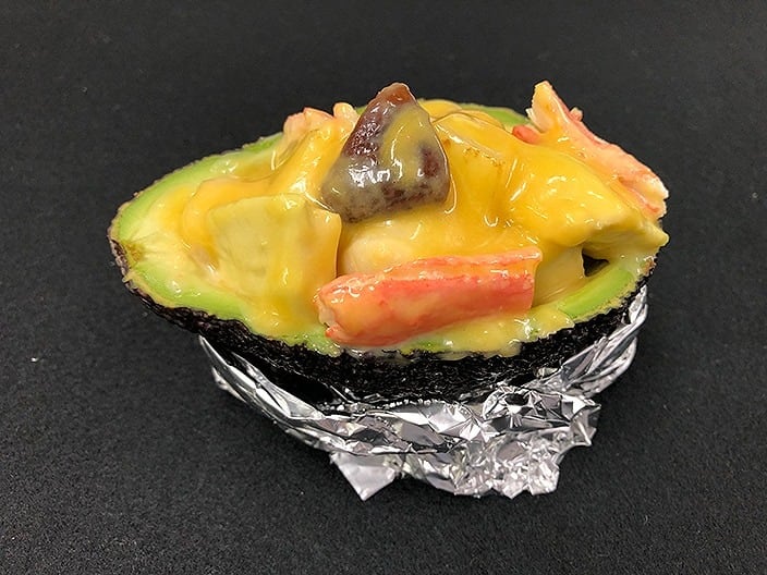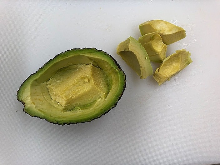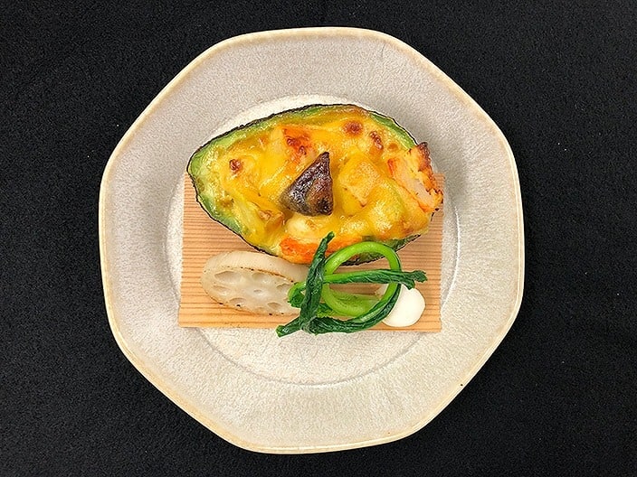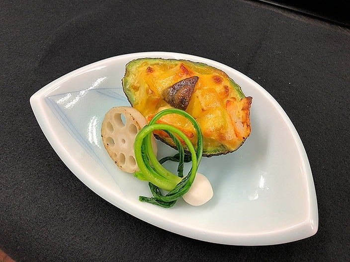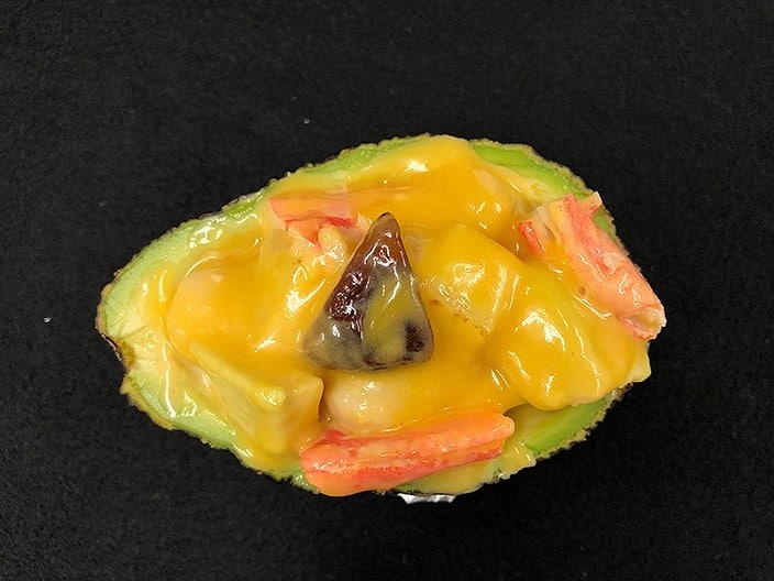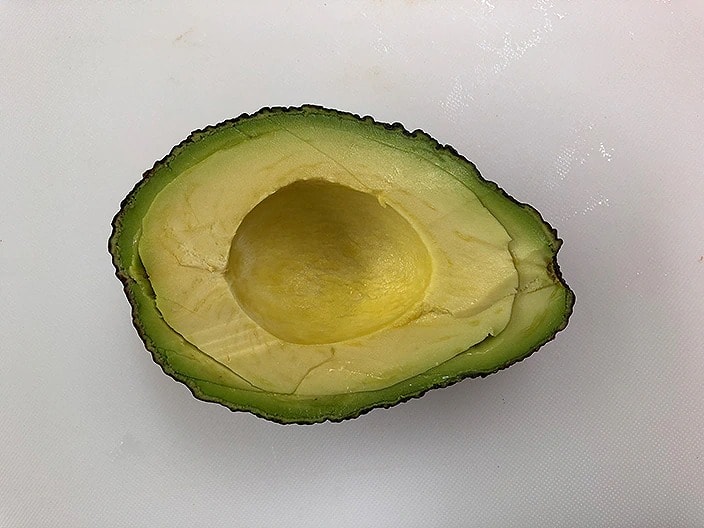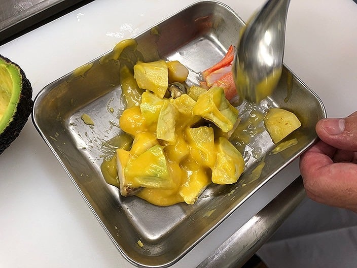 STEP8のアボカドをくり抜く際に少し身を残してくり抜くとアボカドの形が崩れず、きれいに保てます。