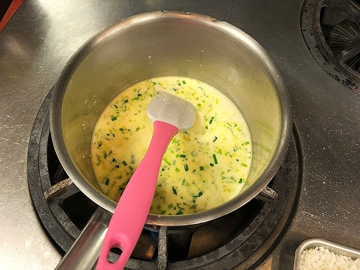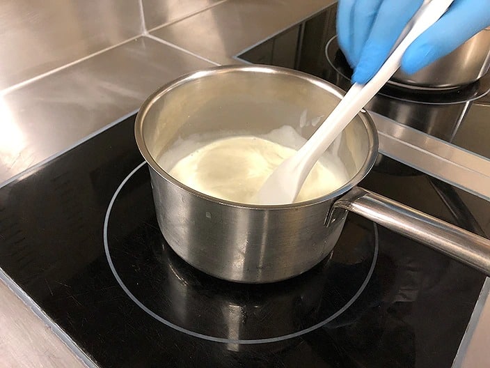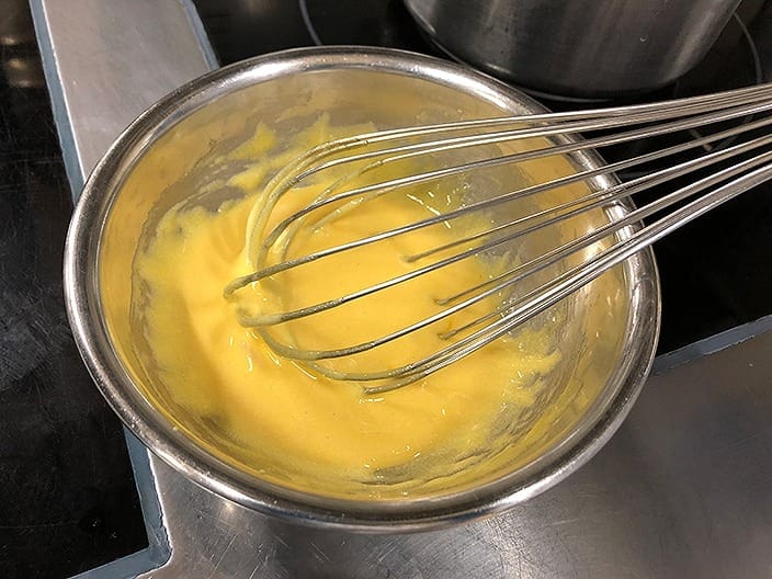 85度以上になると卵黄の凝固が始まるので、温度が上がりすぎないように注意する。
