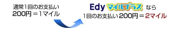 Edy マイルプラス対象店舗なら、Edyでのお支払いで、通常200円ごとに1マイルのところ200円ごとに2マイル貯まります。