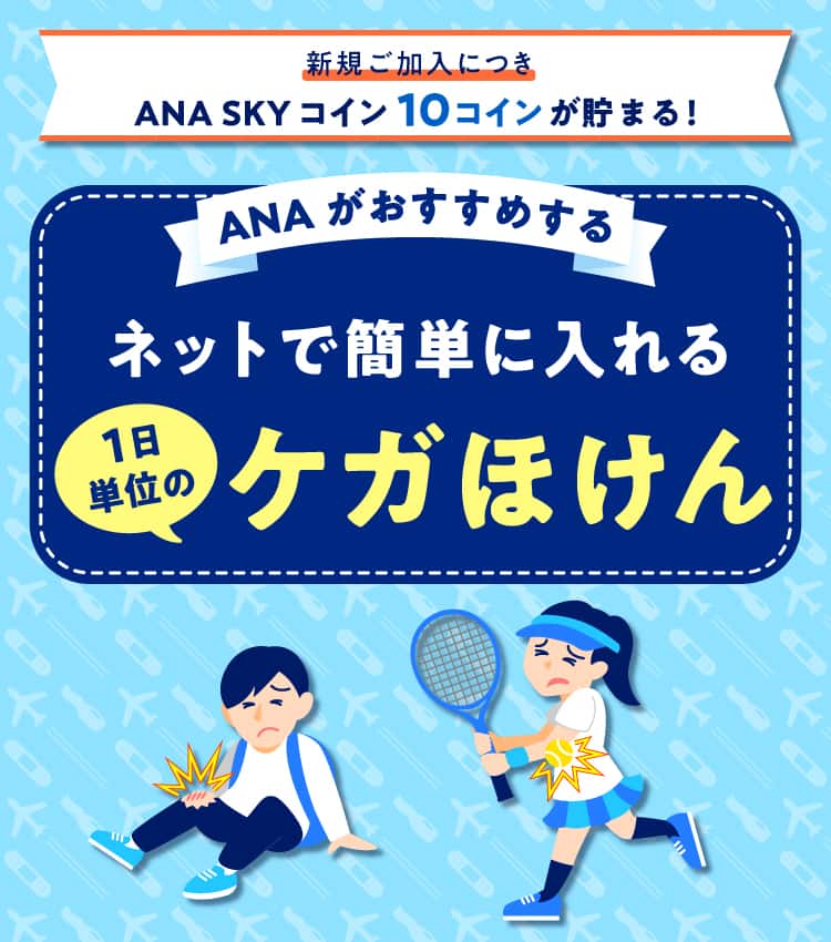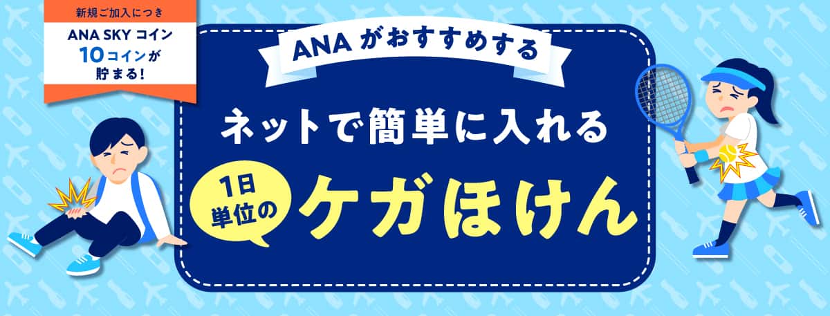 ケガほけん(1日単位加入)・スポーツほけん(1日単位加入)・レジャーほけん(1日単位加入)・ゴルフほけん(1日単位加入)の新規ご加入でANA SKY コイン10コインが貯まります。