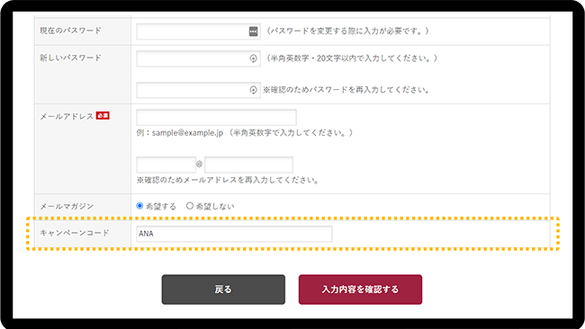 会員登録時にキャンペーンコード「ANA」*をご入力ください。*「 」は不要です。