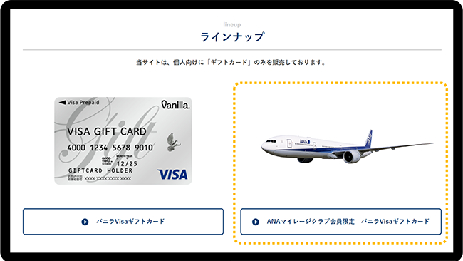 商品選択の際に「ANAマイレージクラブ会員限定バニラVisaギフトカード」をご選択ください。