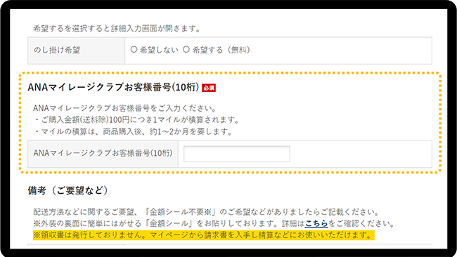 商品ご購入時、ANAマイレージクラブお客様番号(10桁)をご入力ください。
