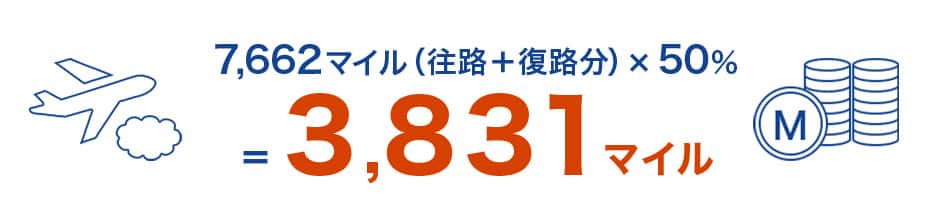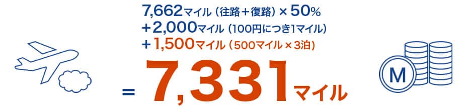 7,662マイル(往路+復路)×50%+2,000マイル(100円につき1マイル)+1,500マイル(500マイル×3泊)=7,331マイル