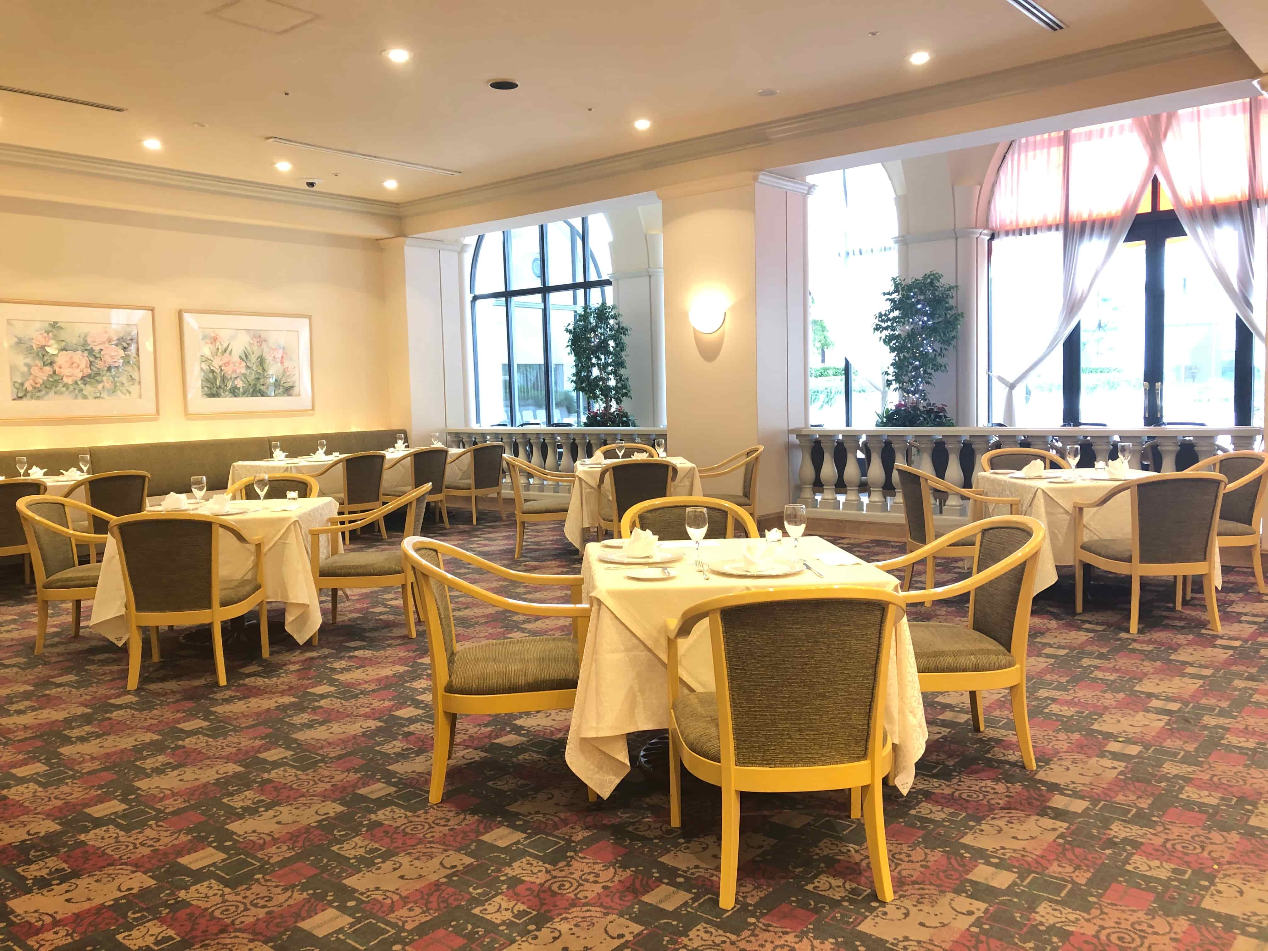 回廊から柔らかな光が差し込む、レストラン「フォンタナ」。