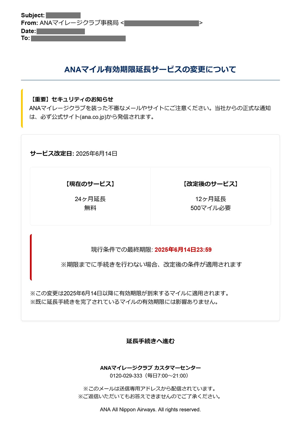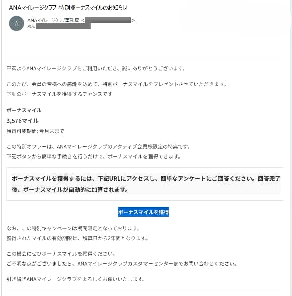「ANAマイレージクラブ特別ボーナスマイルのお知らせ」という件名で、ボーナスマイルの獲得を謳い、アンケートへの回答やURLへのアクセスを促すもの。アクセス先のサイトで個人情報の入力を誘導する可能性があります。