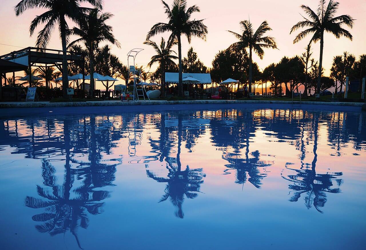 施設内にパームツリーがたくさんあって、まるで海外みたい♡チャペルやビーチ、プールなどいろいろなスポットがあり、カートで自由に移動しながら楽しめます◎