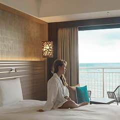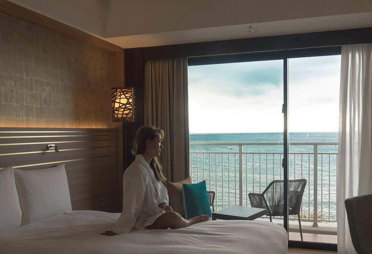 モダンとカジュアルがミックスされたインテリア、爽やかな雰囲気のホテル♡オーシャンビューのお部屋では、海の音を聞きながらのんびり。お部屋から荷物をほとんど持たずに気軽に行くことのできる屋内プールもあり、冬の季節も楽しめます♪ウェルカムドリンクならぬウェルカムスイーツのおもてなしも嬉しいポイント♡