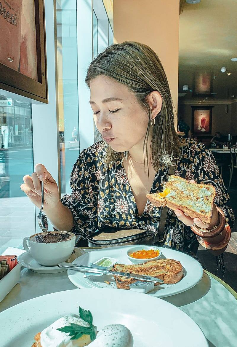 カフェでモーニング。西オーストラリアを中心に展開するカフェで、パース市内にも何軒もあるから、ふらっと立ち寄るのに便利。1日遊び尽くしたいから、オープンサンドやトーストでしっかり腹ごしらえして、出発!