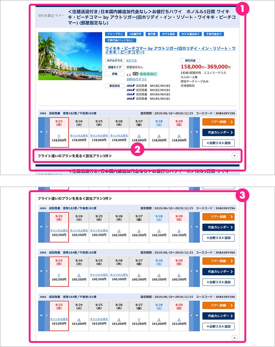 決めます。❶エリアがツアーの紹介です。滞在日数や自分好みのホテル部屋カテゴリーを探してください。