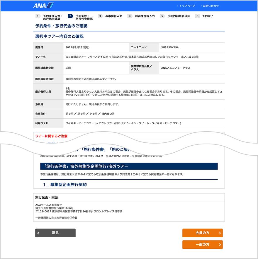 ページ下部にある「会員の方」または、「一般の方」ボタンをクリックして基本情報・お客様情報を入力後、予約内容最終確認で確認したうえで予約を完了させてください。